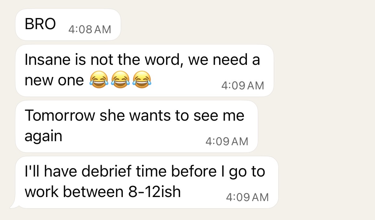 20 minutes later, we're on a date. She didn't know about Goldman. Didn't care.
